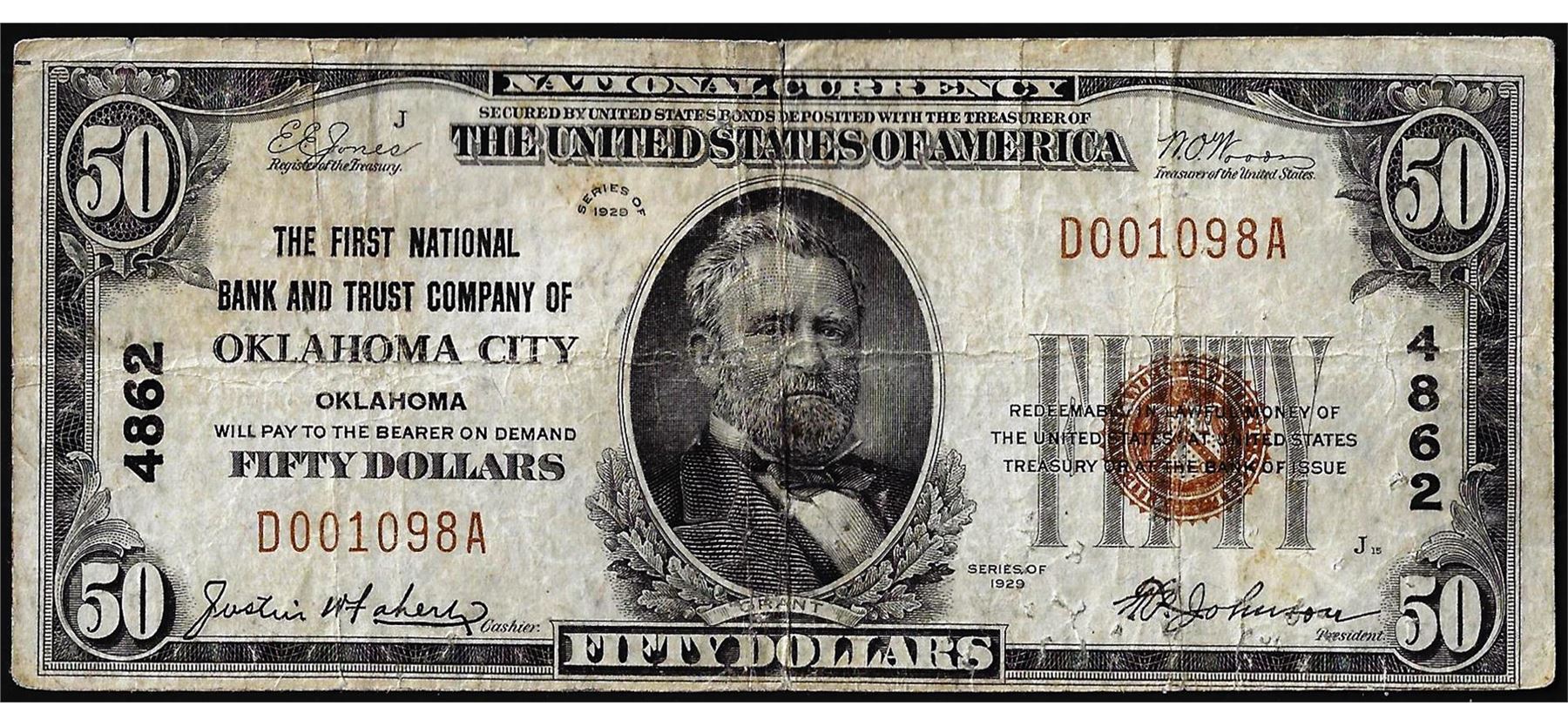 One 1929 $50 First NB & Trust Company Oklahoma City, OK CH# 4862 National Currency Note.