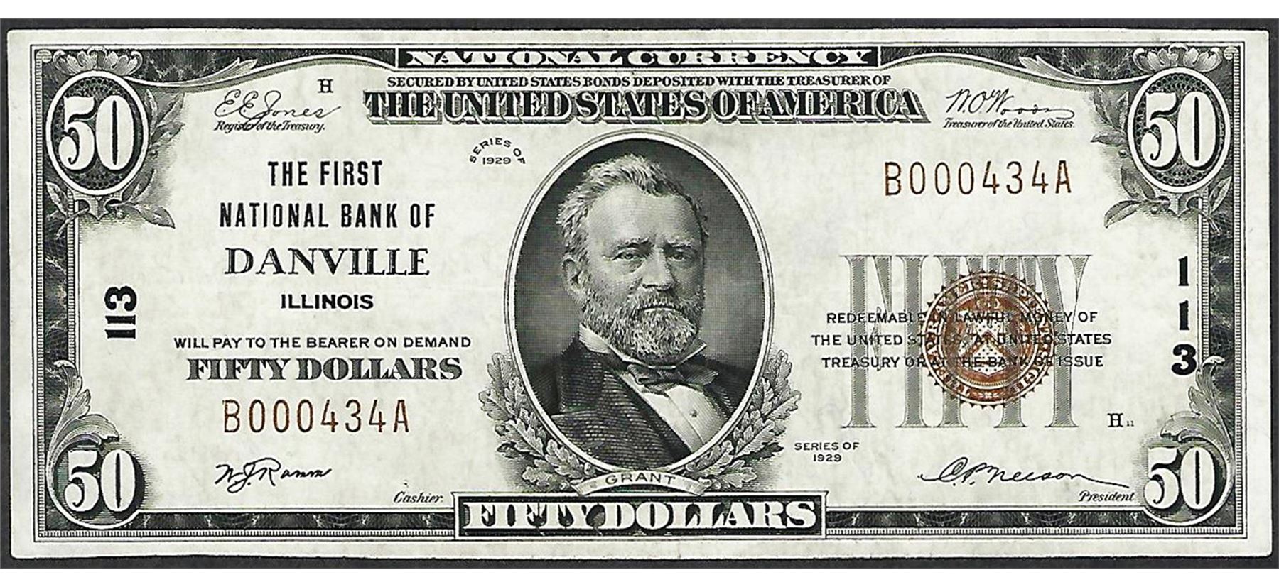 One 1929 $50 First National Bank Danville, IL CH# 113 National Currency Note.