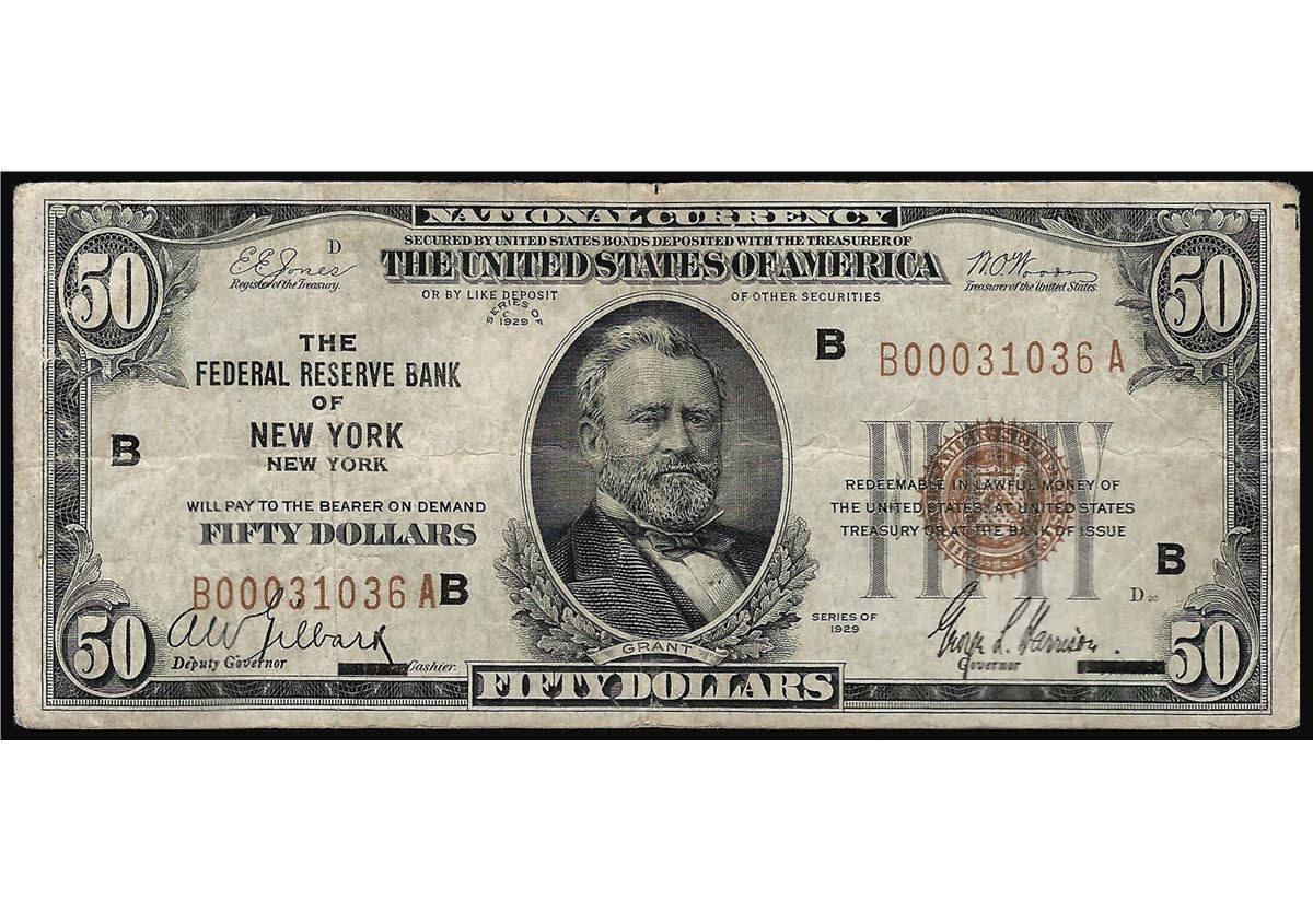 One 1929 $50 National Bank of New York, NY National Currency Note.