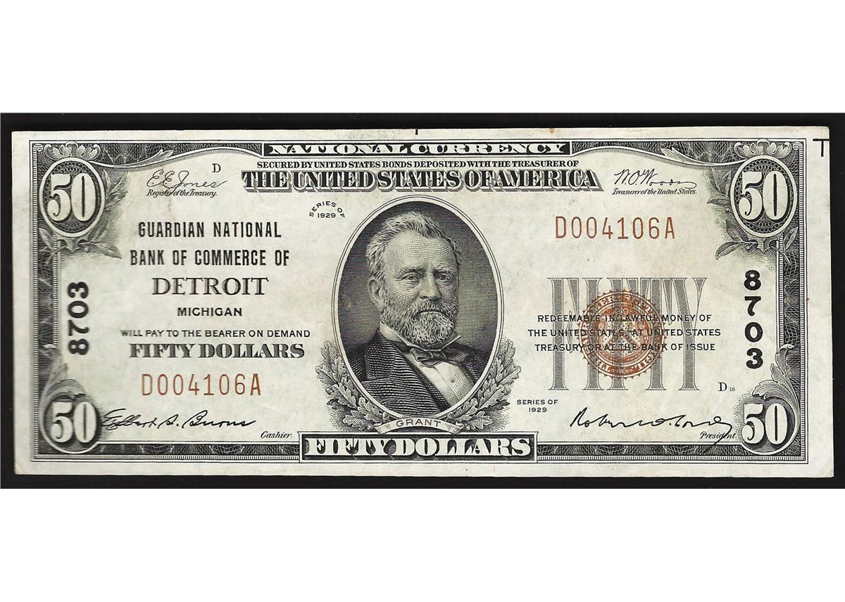 One 1929 $50 National Currency Note Guardian National Bank of Commerce of Detroit.