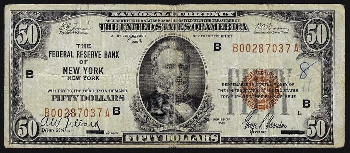 One 1929 $50 National Currency Note New York New York.
