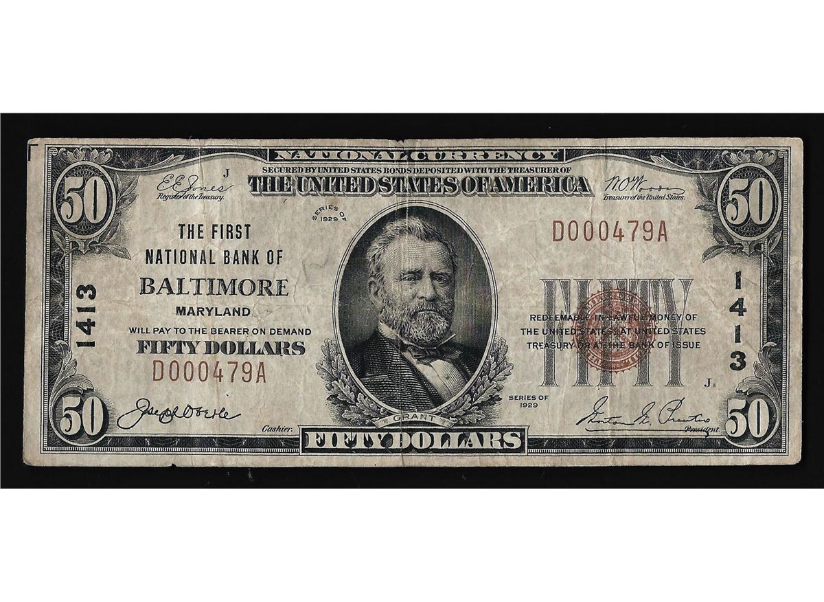 One 1929 $50 The First National Bank of Baltimore, MD Currency Note.