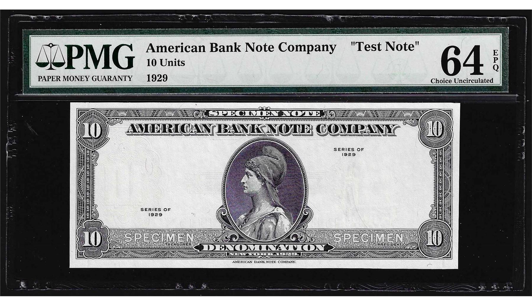 One 1929 American Bank Note Company Test Note 10 Units PMG 64EPQ. PMG Certified.