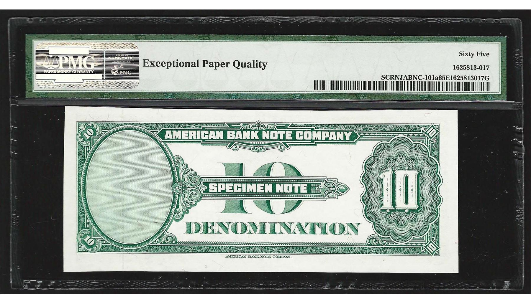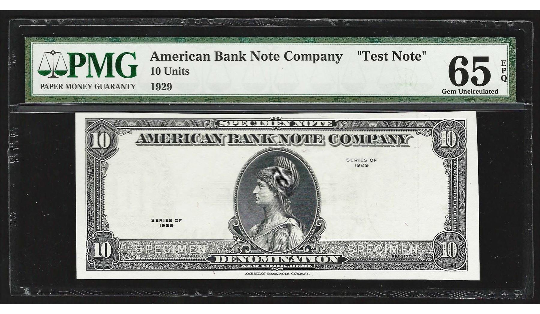One 1929 American Bank Note Company Test Note 10 Units PMG 65EPQ. PMG Certified.