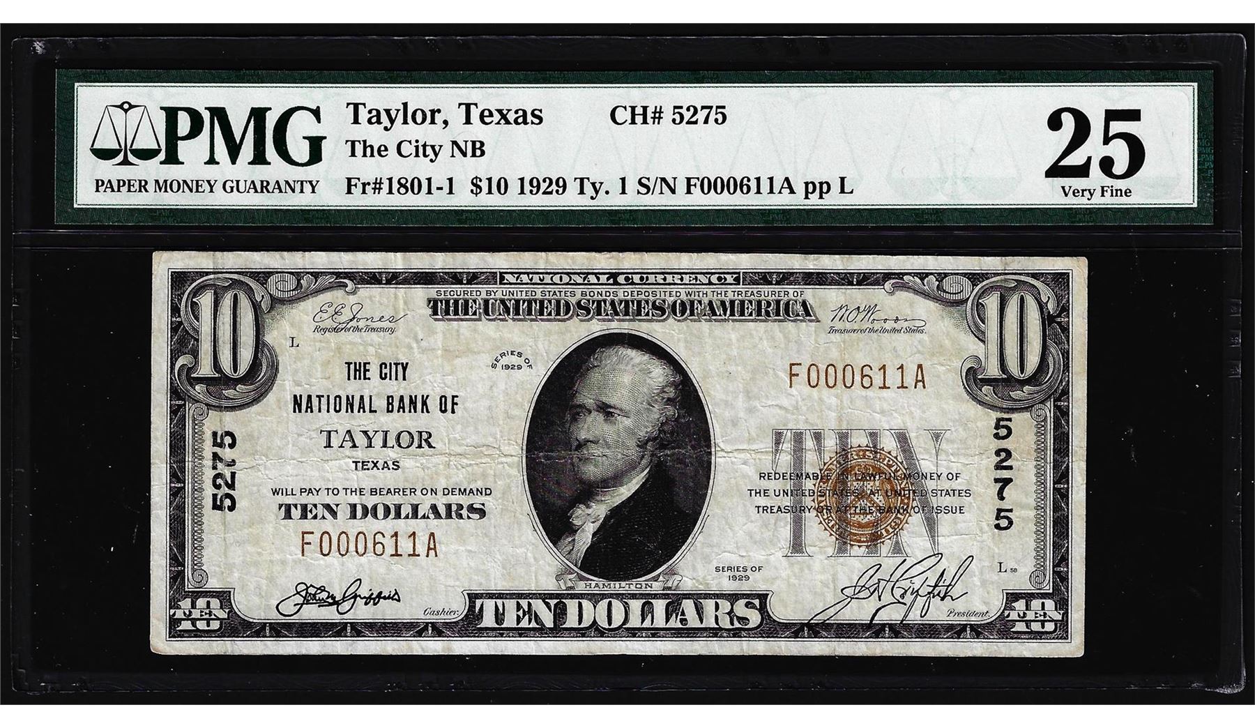 One 1929 City NB of Taylor, TX CH# 5275 National Currency Note PMG Very Fine 25. PMG Certified.