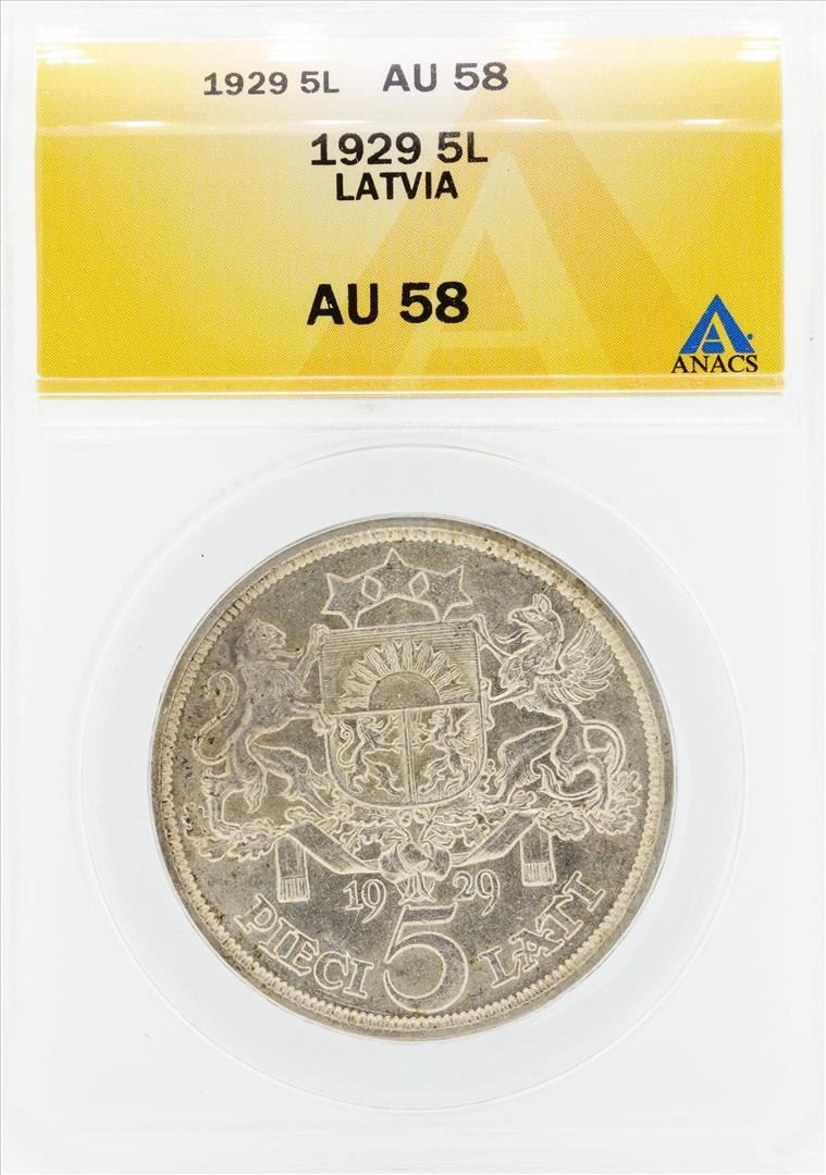 One 1929 Pieci 5 Lativia Coin ANACS AU58. ANACS Certified.