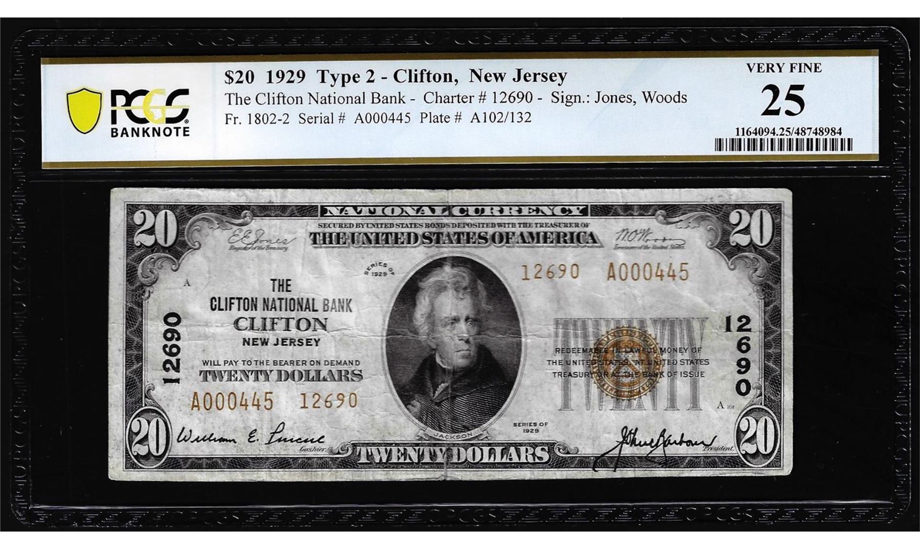 1929 Ty.2 $20 Clifton, New Jersey CH #12690 National Currency Note PCGS Very Fine 25