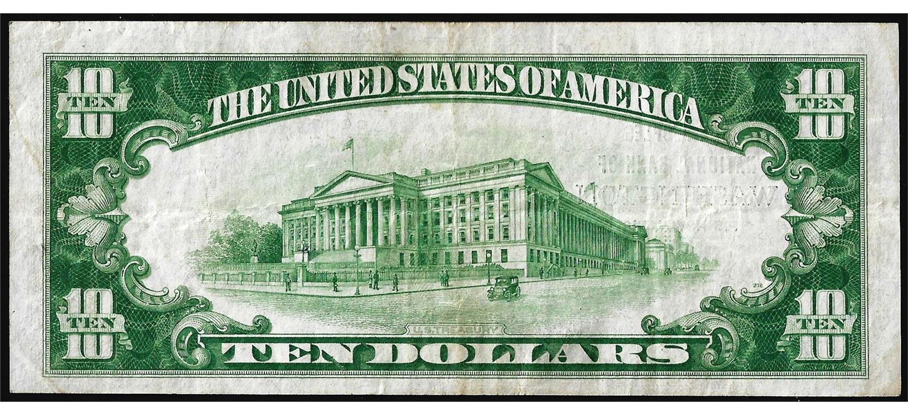 One 1929 Type 2 $10 Peoples NB of Washington, PA CH# 9901 National Currency Note.