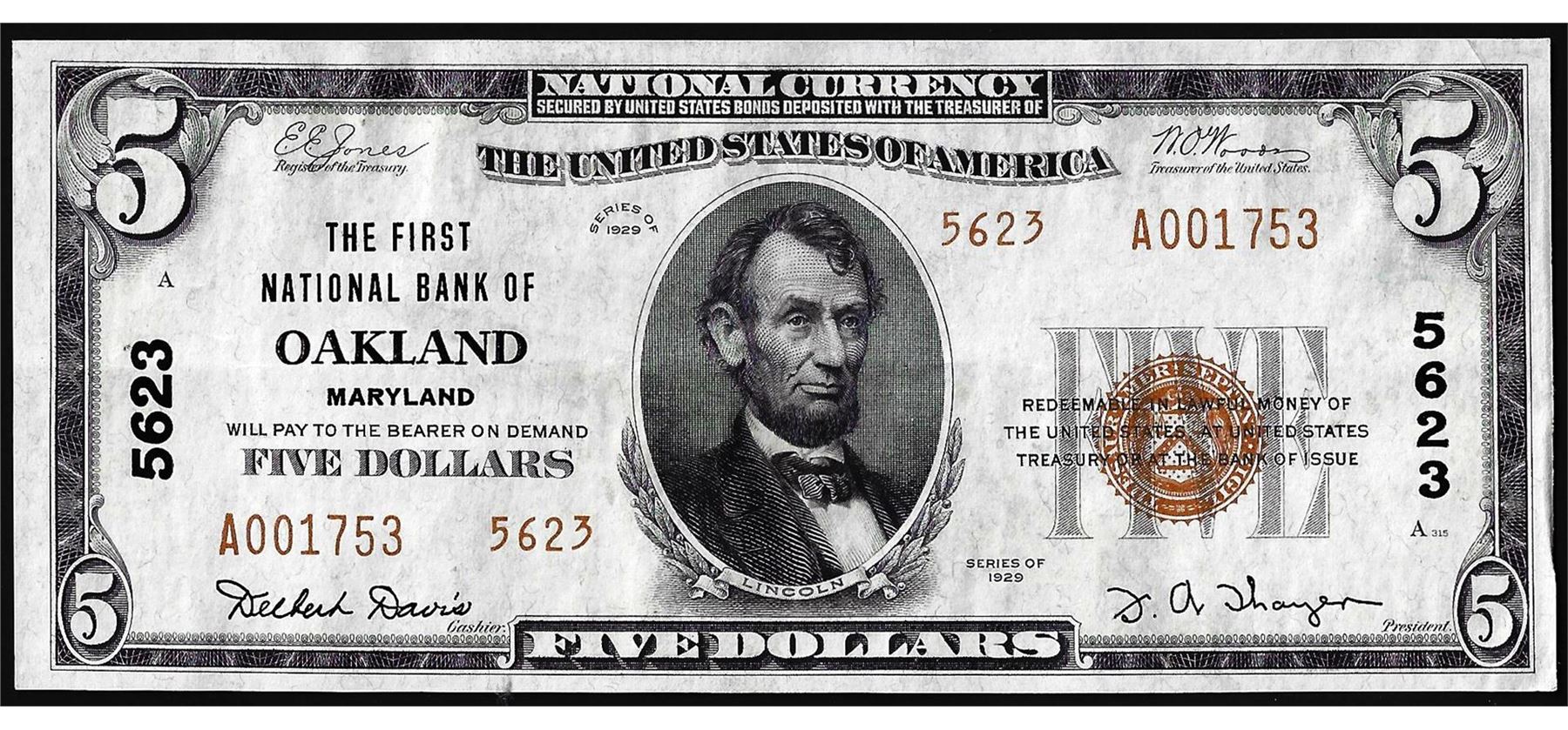 One 1929 Type 2 $5 First NB in Oakland, Maryland CH# 5623 National Currency Note.