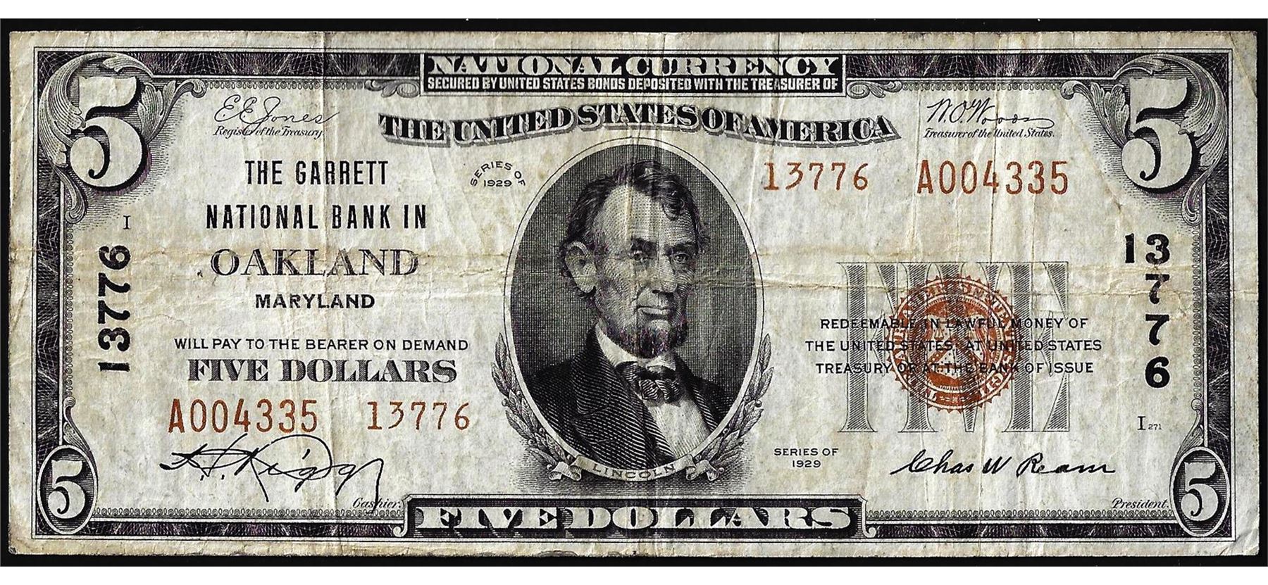 One 1929 Type 2 $5 Garrett NB in Oakland, Maryland CH# 13776 National Currency Note.