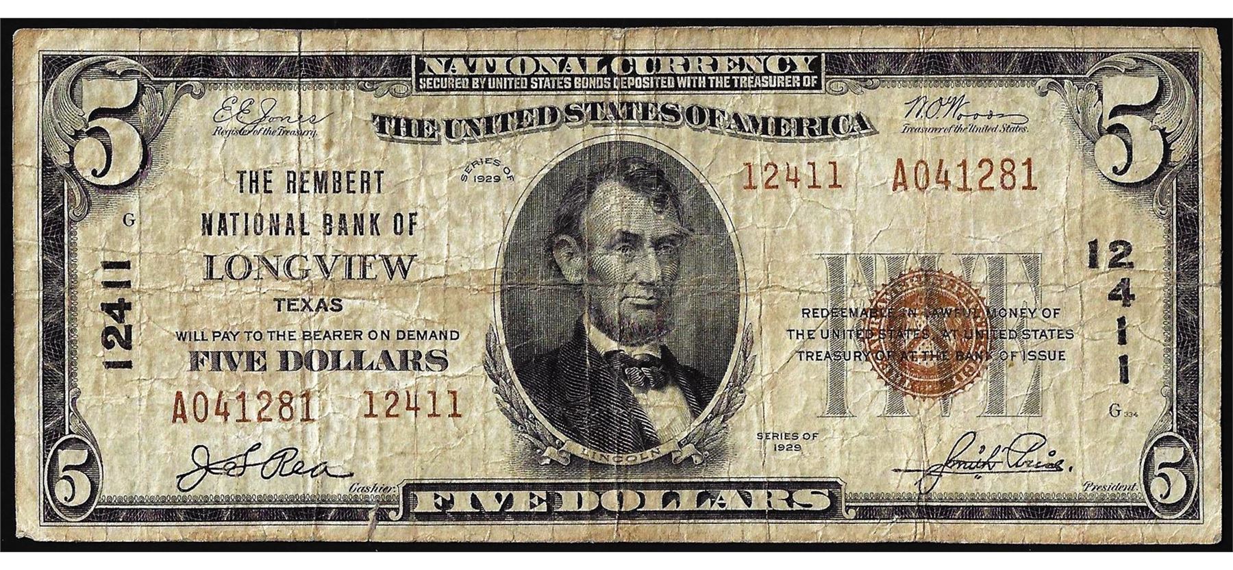 One 1929 Type 2 $5 National Bank of Longview, Texas CH# 12411 National Currency Note.