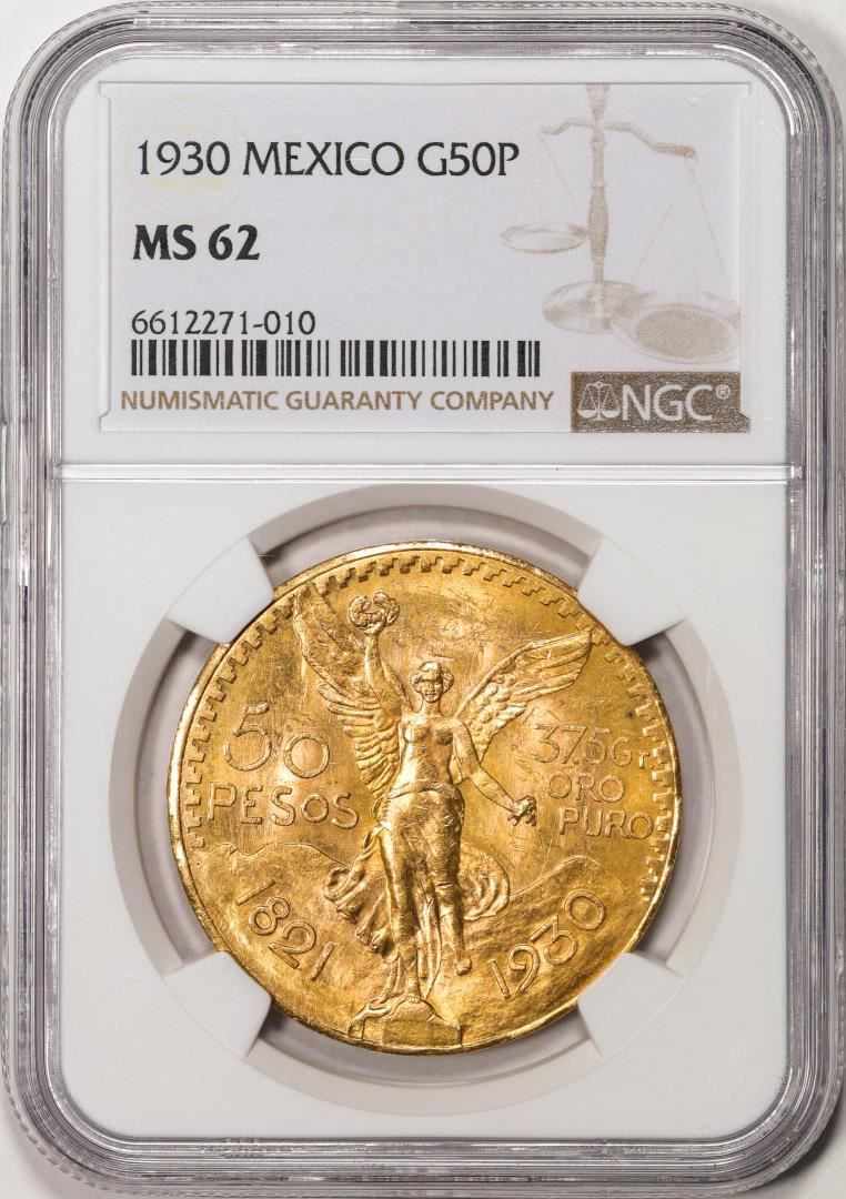 One 1930 Mexico 50 Pesos Gold Coin NGC MS62. NGC Certified.