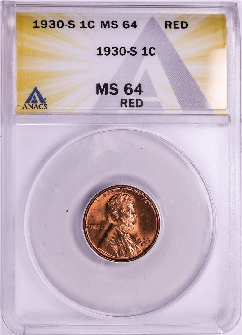 One 1930-S Lincoln Wheat Cent Coin ANACS MS64 Red. ANACS Certified.