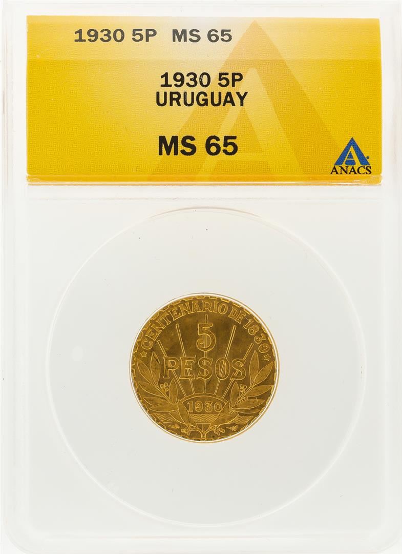 One 1930 Uruguay 5 Pesos Gold Coin ANACS MS65. ANACS Certified.
