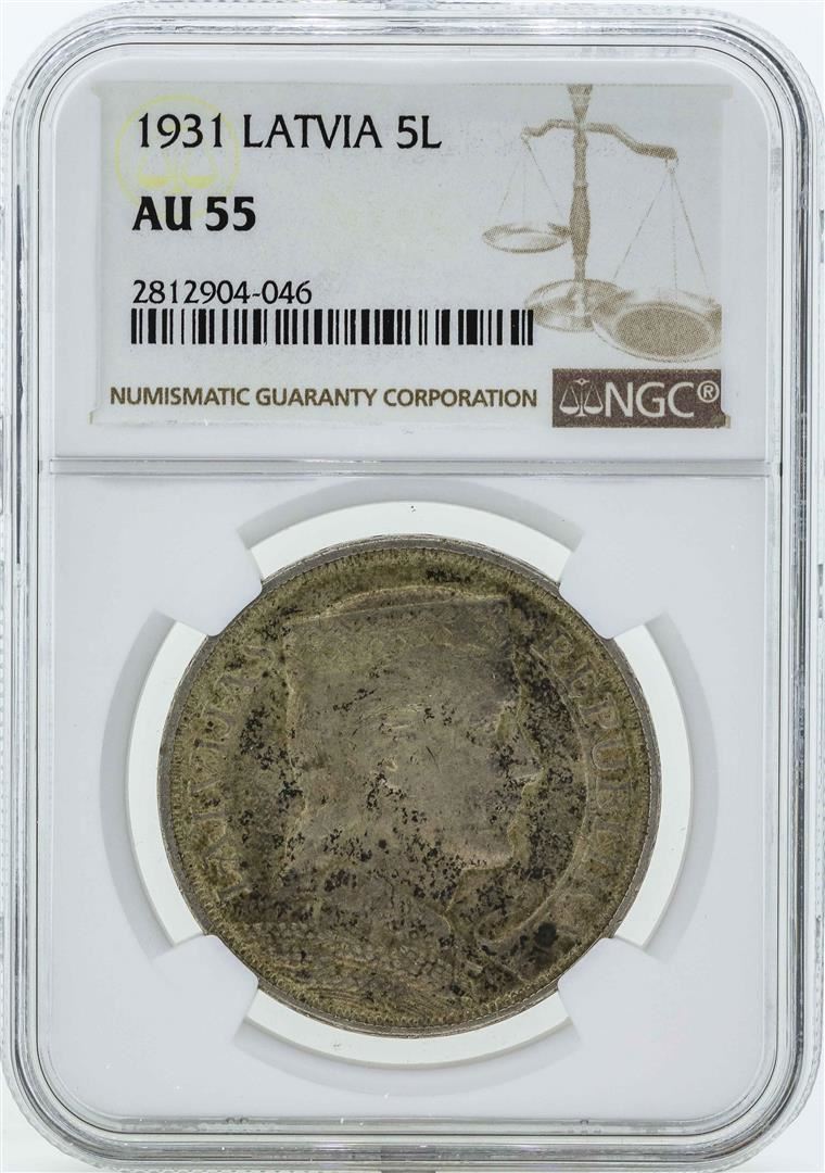 One 1931 Latvia 5 Lati Coin NGC AU55. NGC Certified.