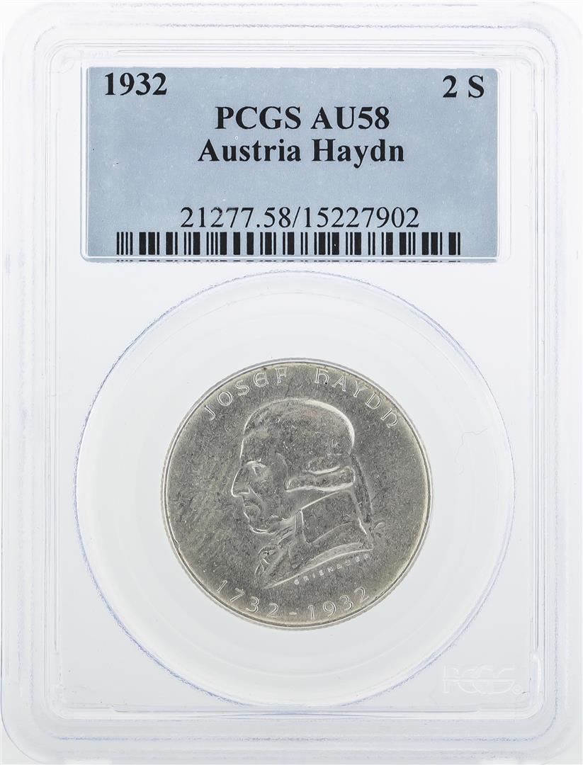 One 1932 Austria Haydn 2 Shilling Silver Coin PCGS AU58. PCGS Graded.
