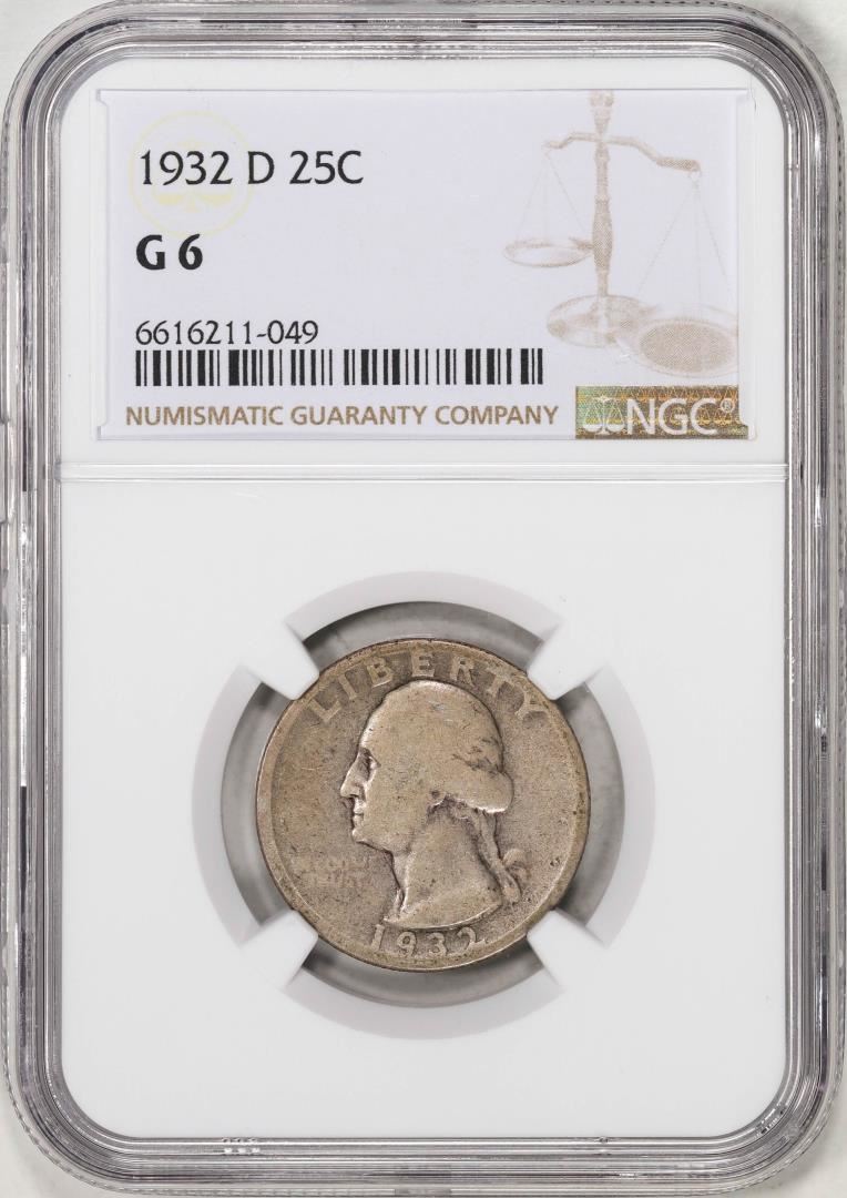 One 1932-D Washington Quarter Coin NGC G6. NGC Certified.