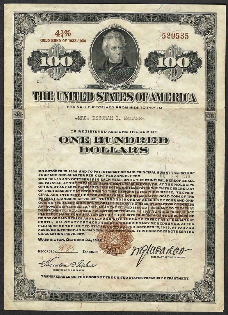 One 1933-1938 4 1/4% Liberty Loan Gold Bond.