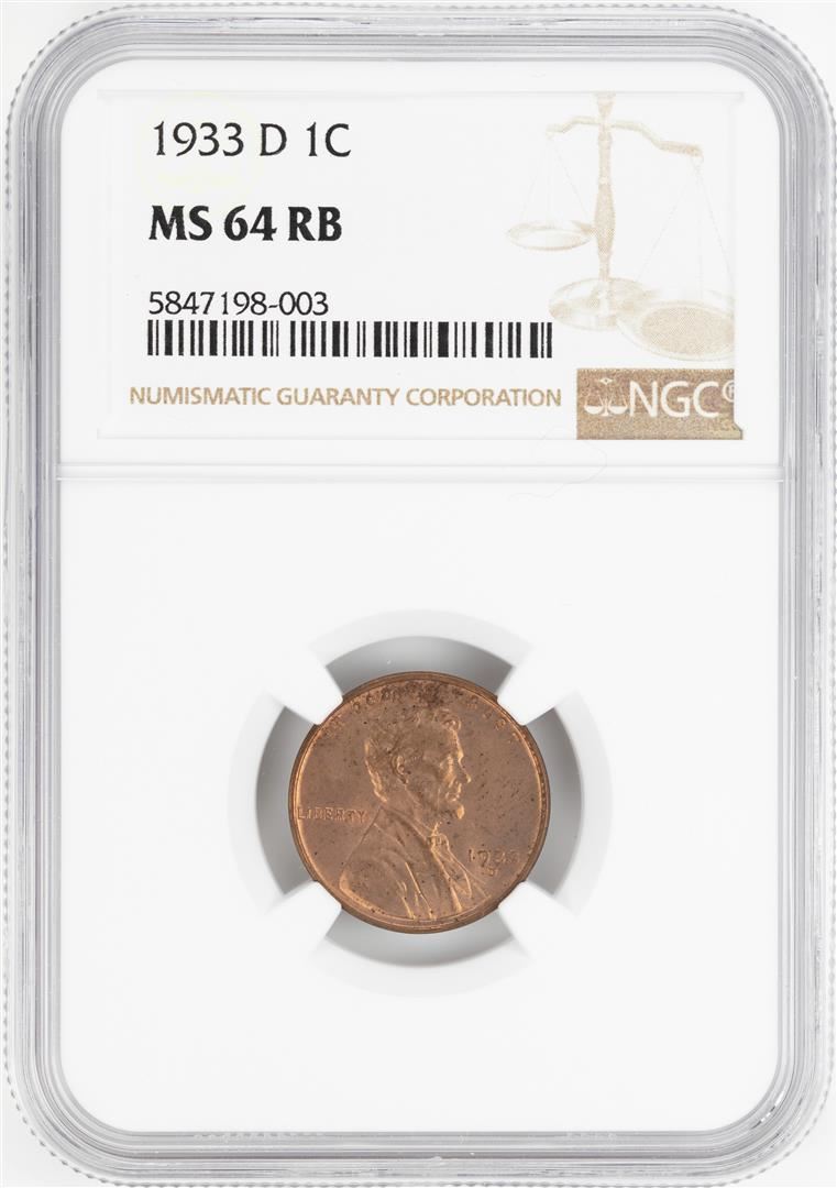 One 1933-D Lincoln Wheat Cent Coin NGC MS64RB. NGC Certified.