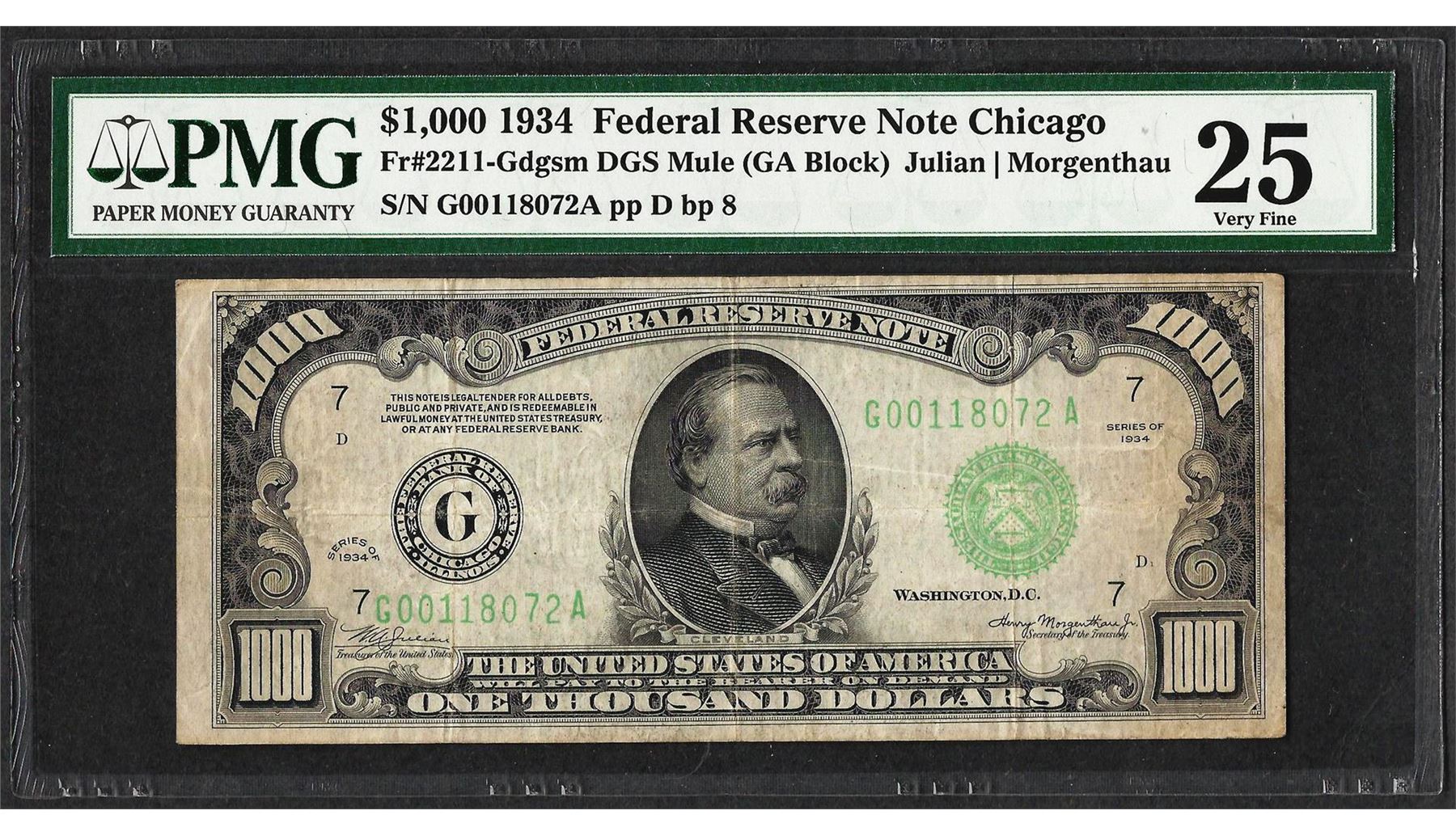 One 1934 $1,000 Federal Reserve Note Chicago Fr.2211-G Mule PMG Very Fine 25. PMG Certified.