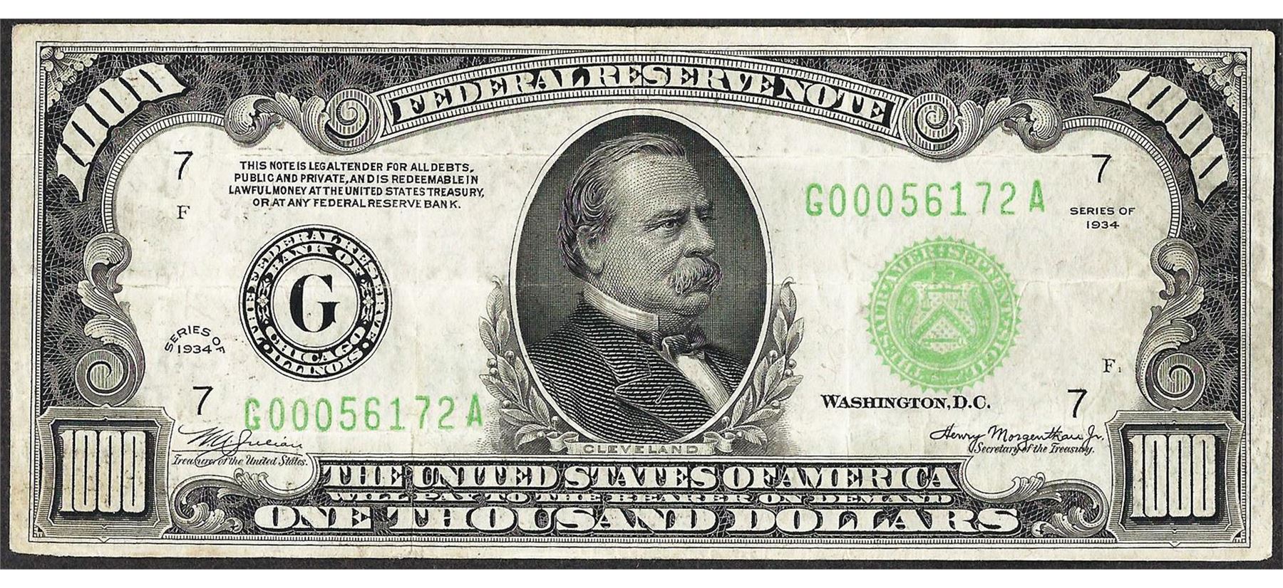 One 1934 $1,000 Federal Reserve Note Chicago.