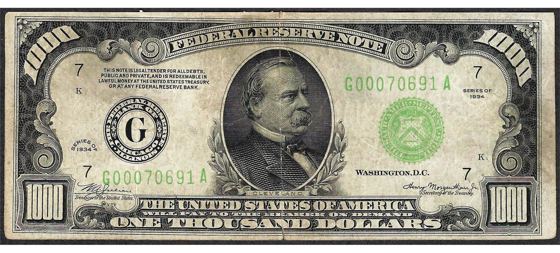 One 1934 $1,000 Federal Reserve Note Chicago.