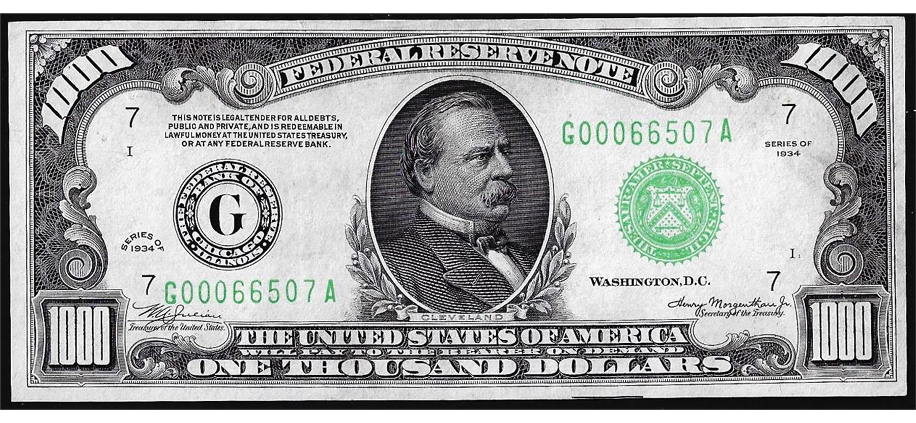 One 1934 $1,000 Federal Reserve Note Chicago.