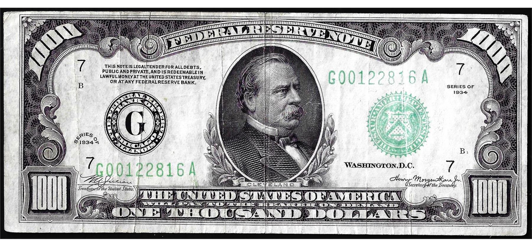 One 1934 $1,000 Federal Reserve Note Chicago.