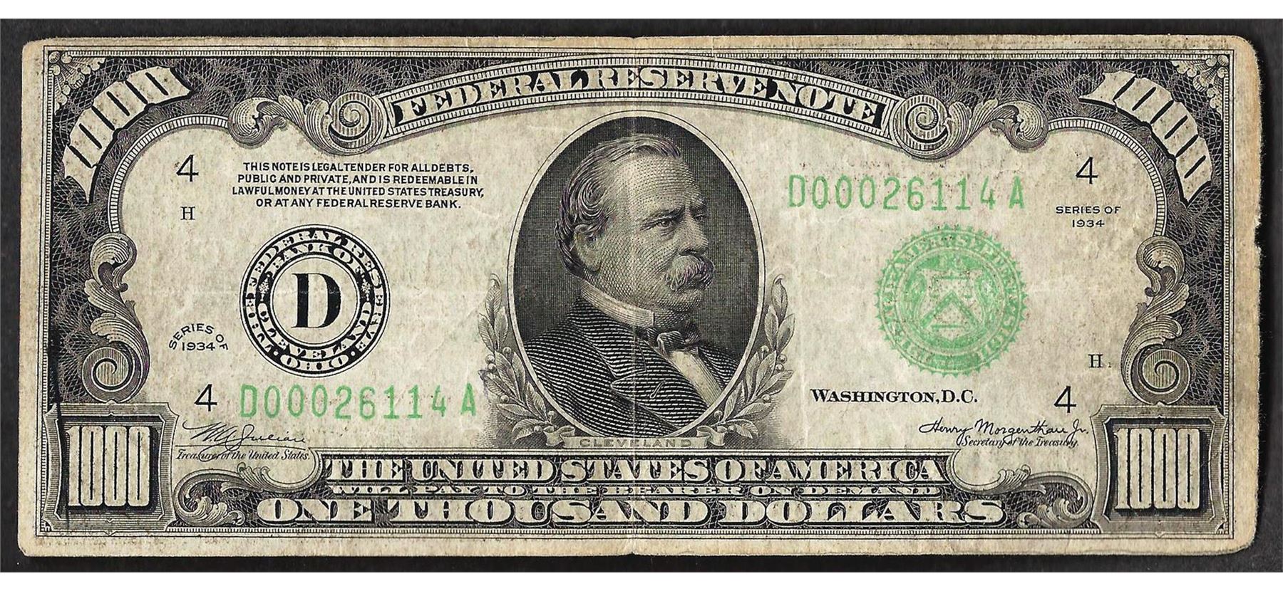 One 1934 $1,000 Federal Reserve Note Cleveland.