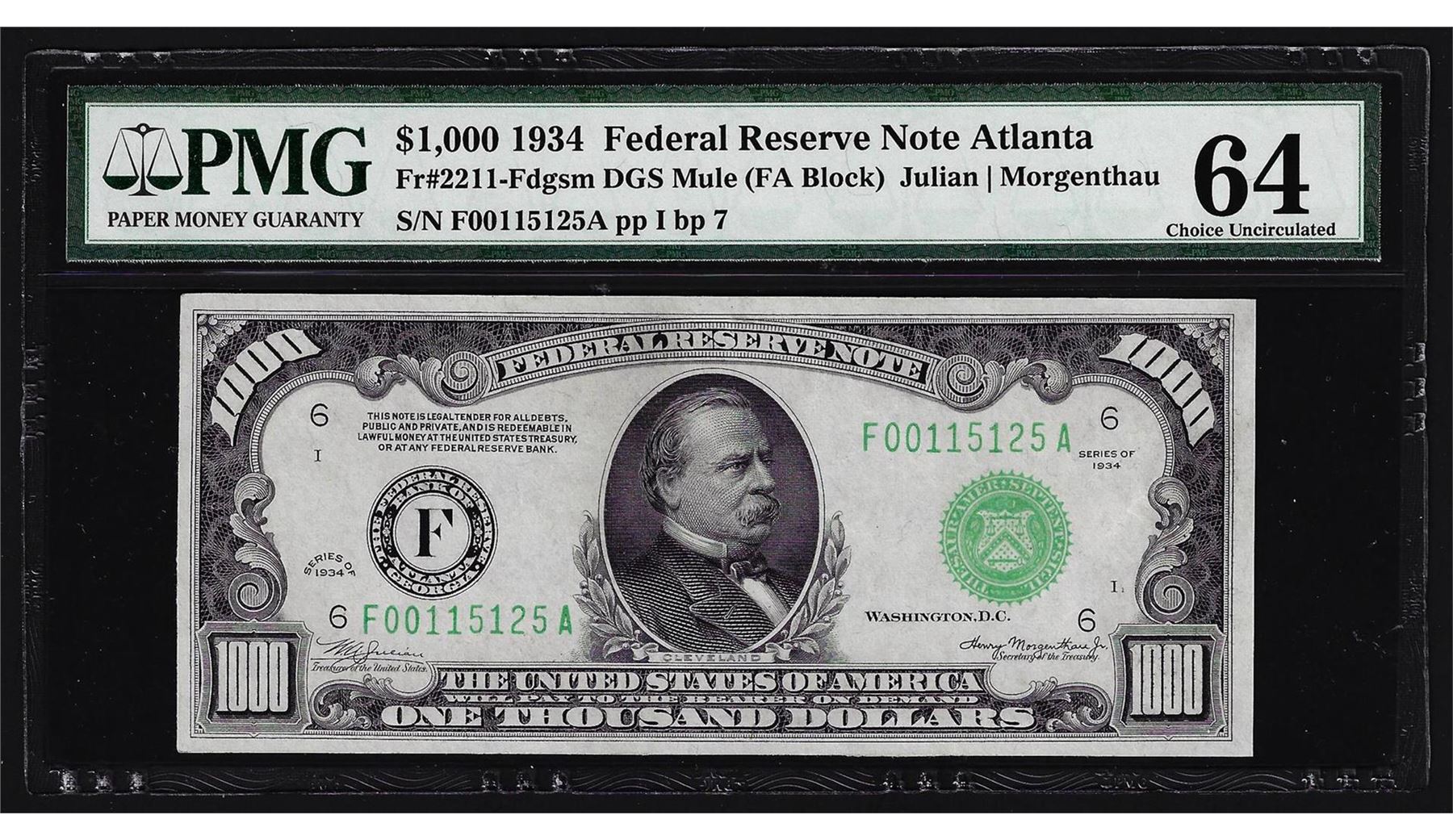 One 1934 $1,000 Mule Federal Reserve Note Atlanta PMG Choice Uncirculated 64. PMG Certified.