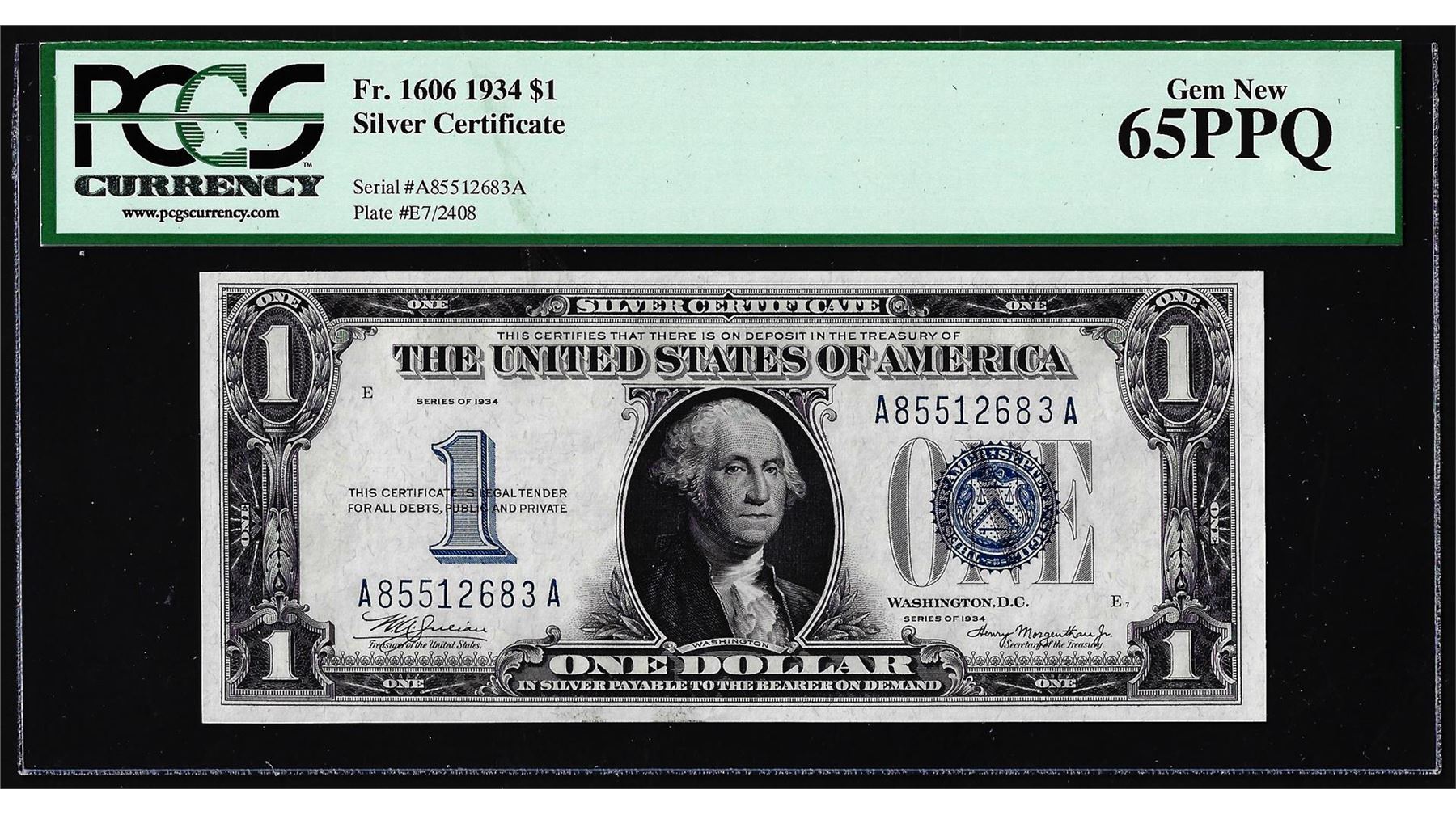 One 1934 $1 Funnyback Silver Certificate Note FR.1606 PCGS Gem New 65PPQ. PCGS Graded.