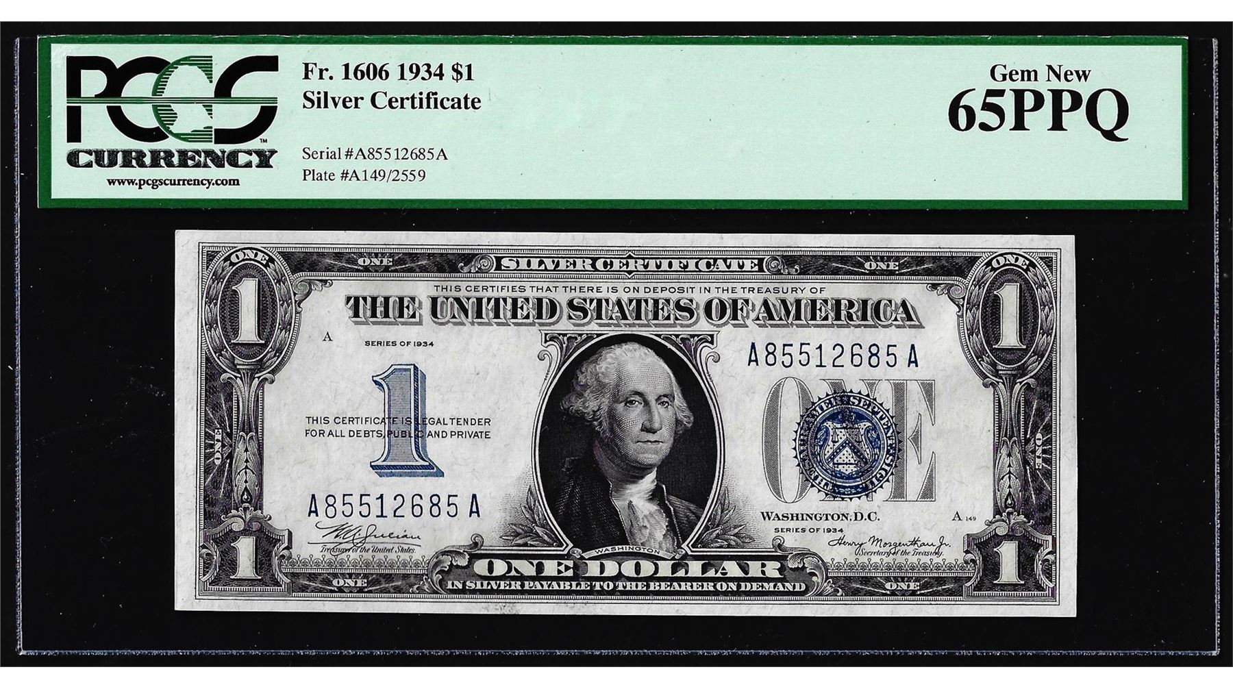 One 1934 $1 Funnyback Silver Certificate Note FR.1606 PCGS Gem New 65PPQ. PCGS Graded.