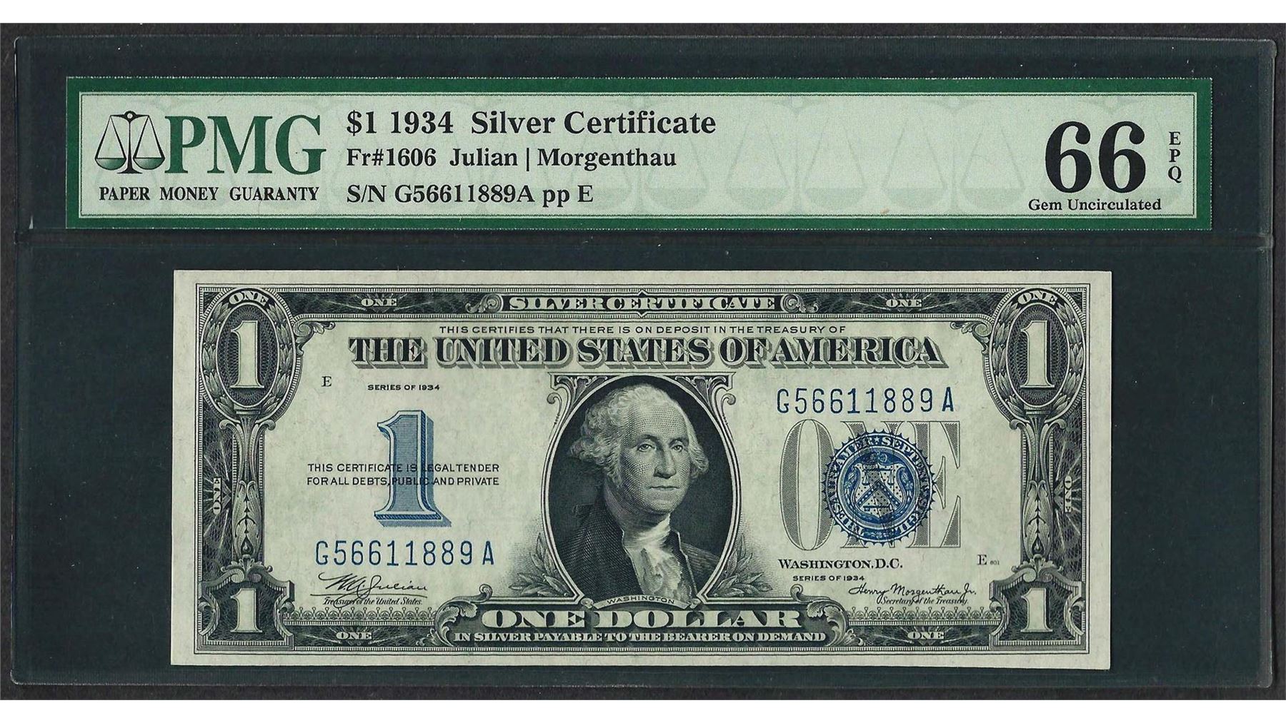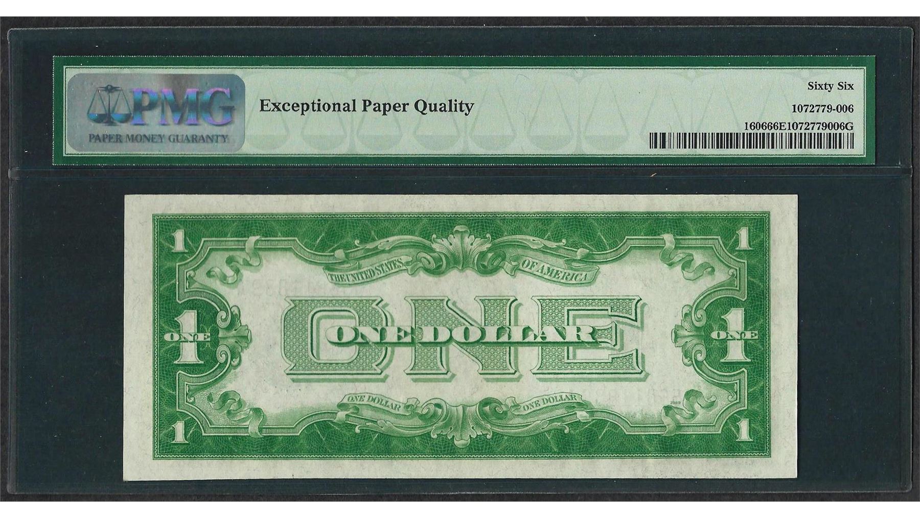 One 1934 $1 Funnyback Silver Certificate Note Fr.1606 PMG Gem Uncirculated 66EPQ. PMG Certified.
