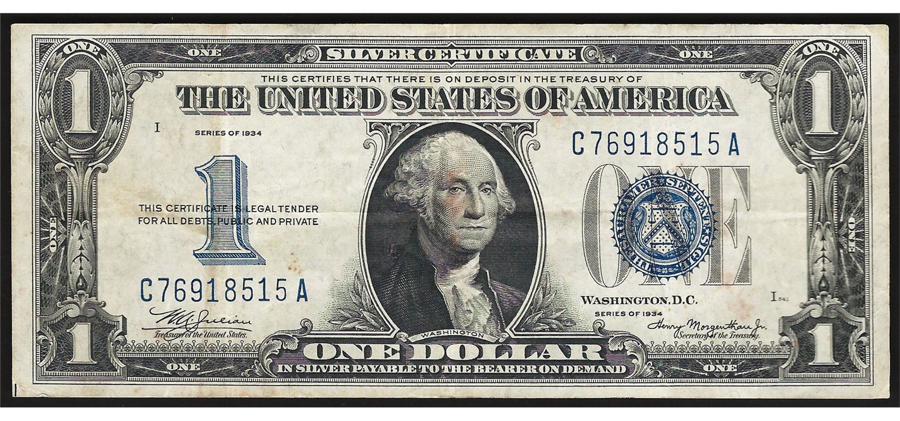 One 1934 $1 Funnyback Silver Certificate Note.