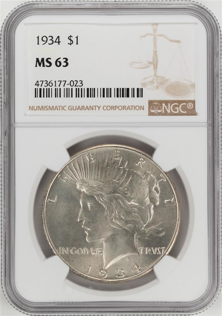 One 1934 $1 Peace Silver Dollar Coin NGC MS63. NGC Certified.