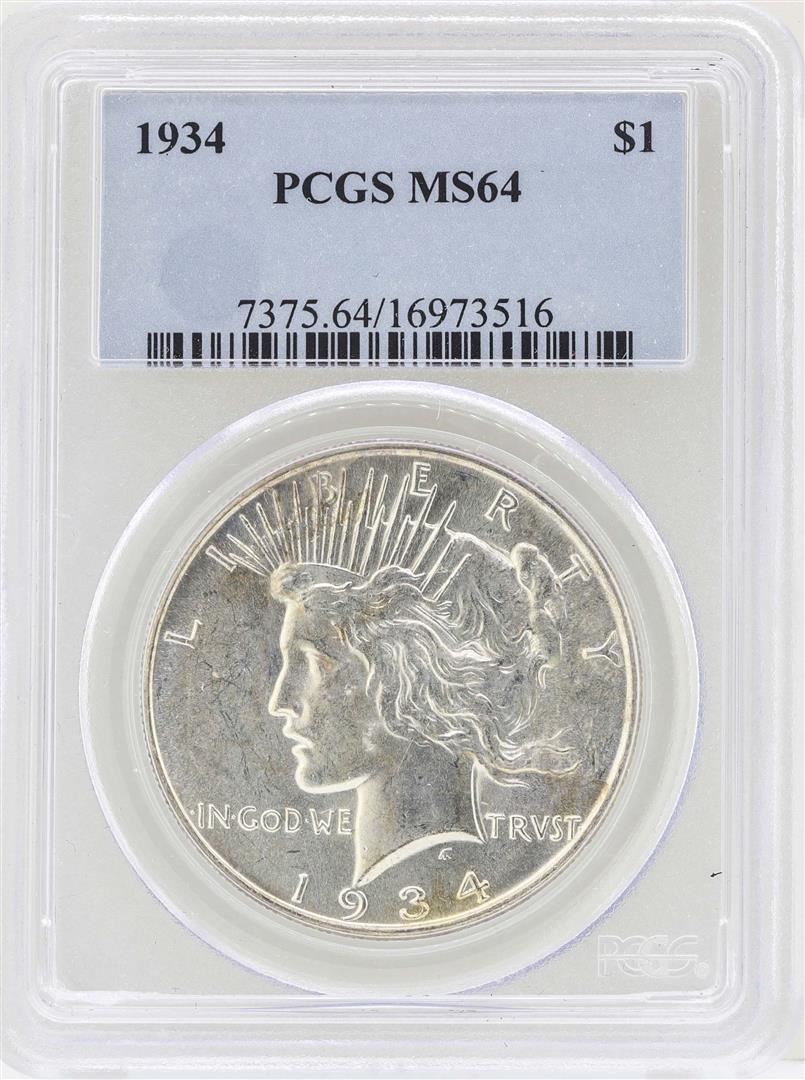 One 1934 $1 Peace Silver Dollar Coin PCGS MS64. PCGS Graded.