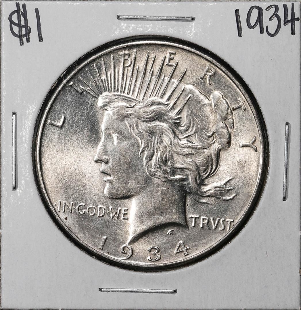 One 1934 $1 Peace Silver Dollar Coin.