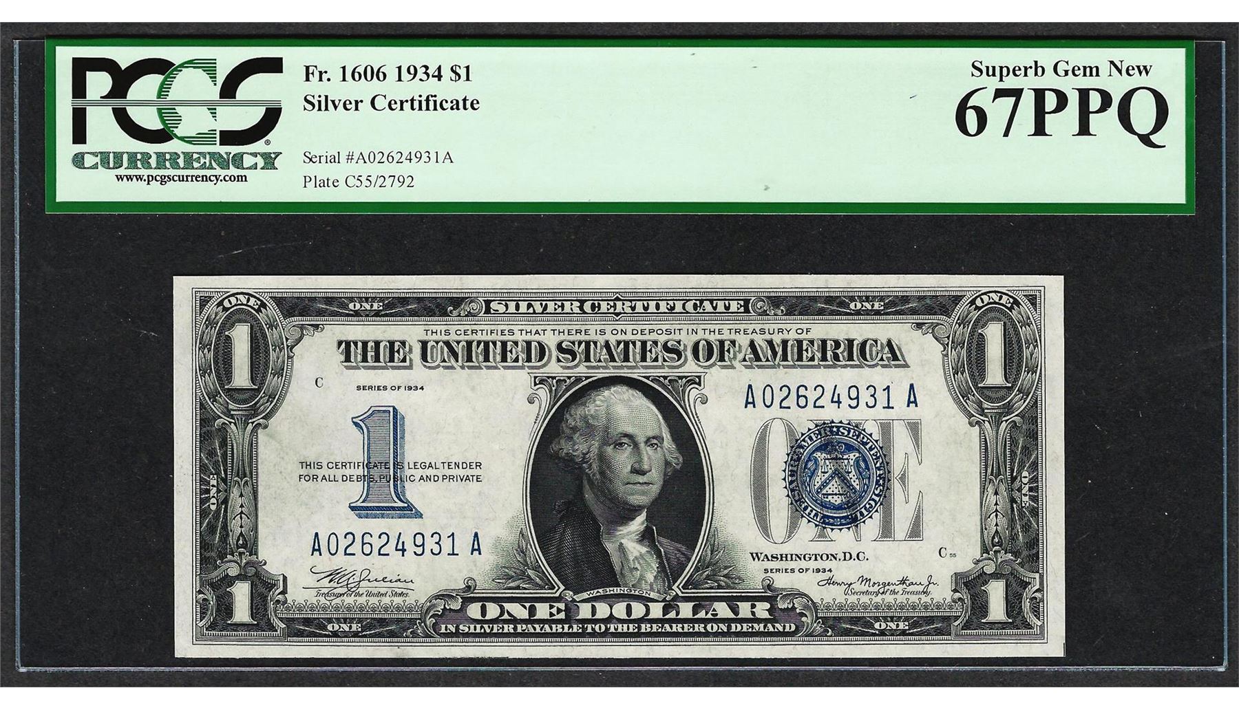 One 1934 $1 Silver Certificate Note Fr.1606 PCGS Superb Gem New 67PPQ. PCGS Graded.