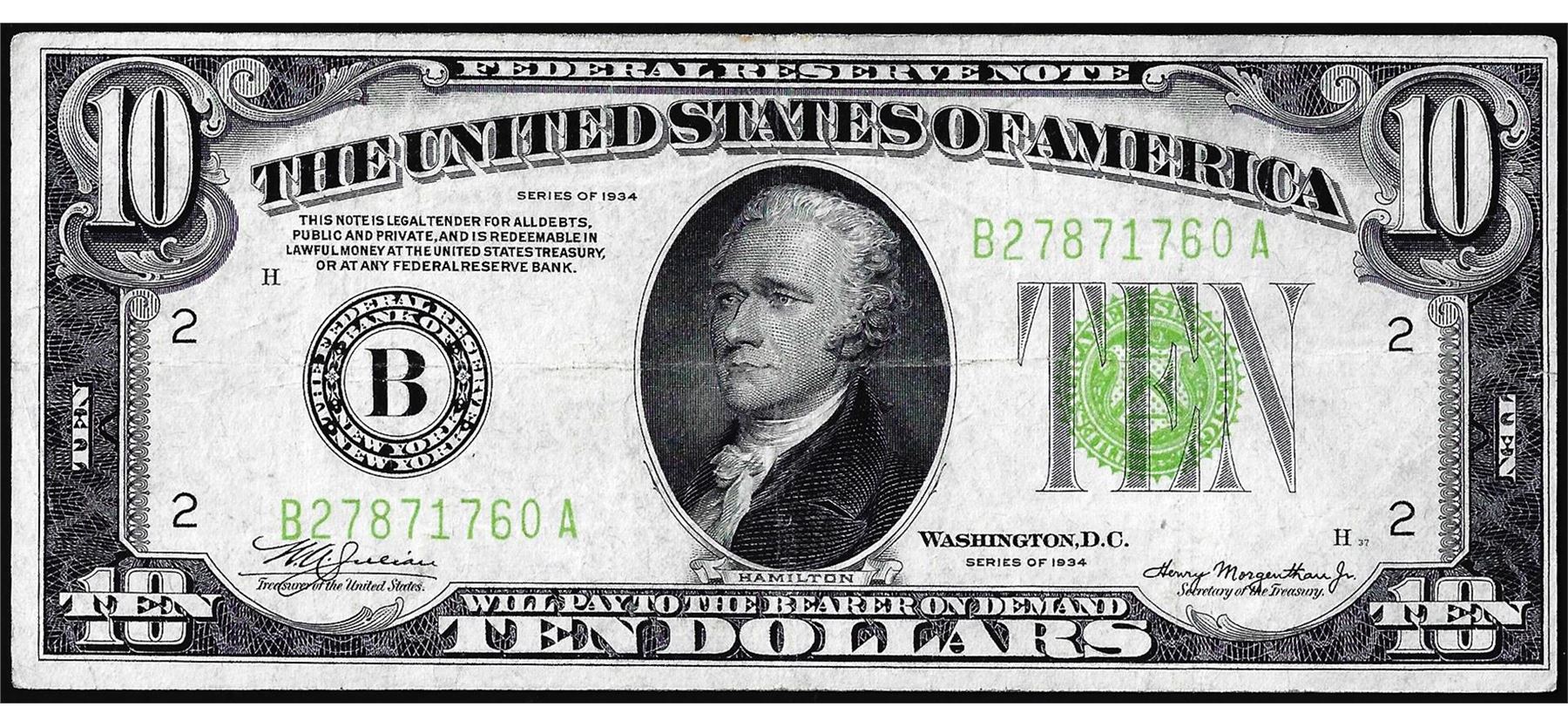 One 1934 $10 Federal Reserve Note New York Light Green Seal.