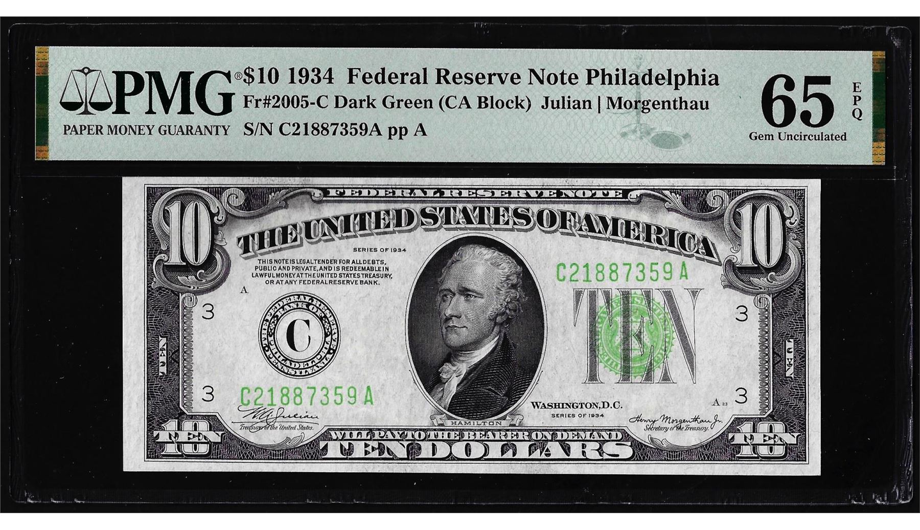 One 1934 $10 Federal Reserve Note Philadelphia Fr.2005-C PMG Gem Uncirculated 65EPQ. PMG Certified.