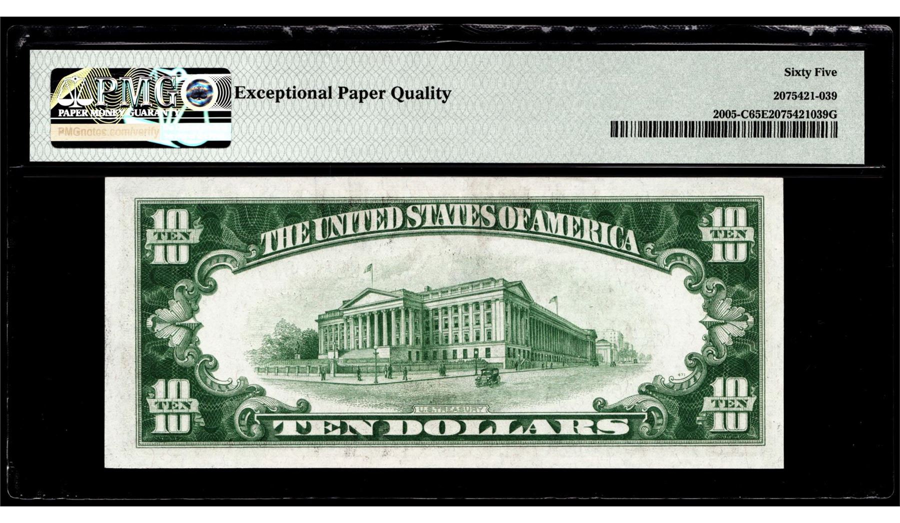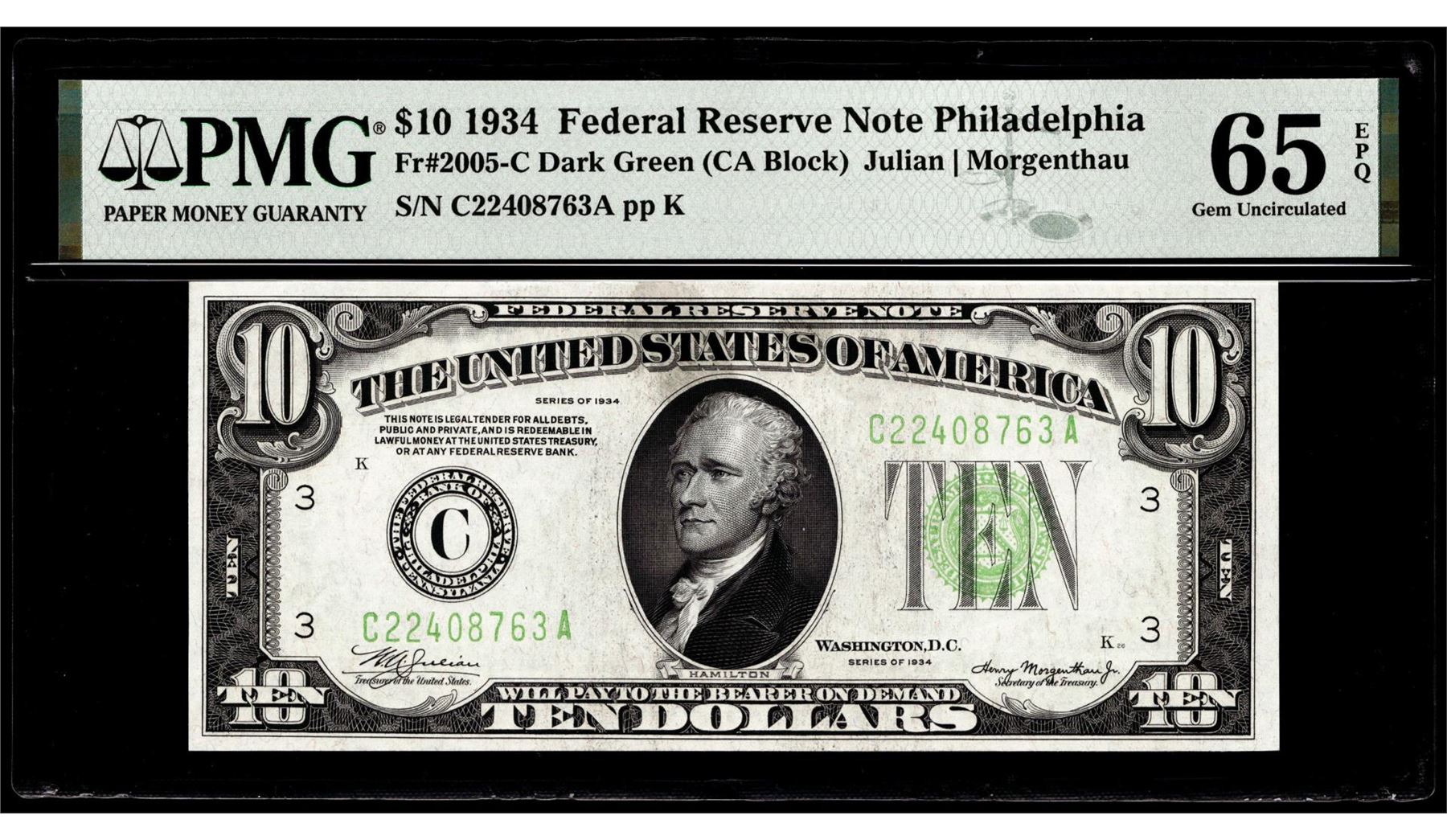 One 1934 $10 Federal Reserve Note Philadelphia Fr.2005-C PMG Gem Uncirculated 65EPQ. PMG Certified.
