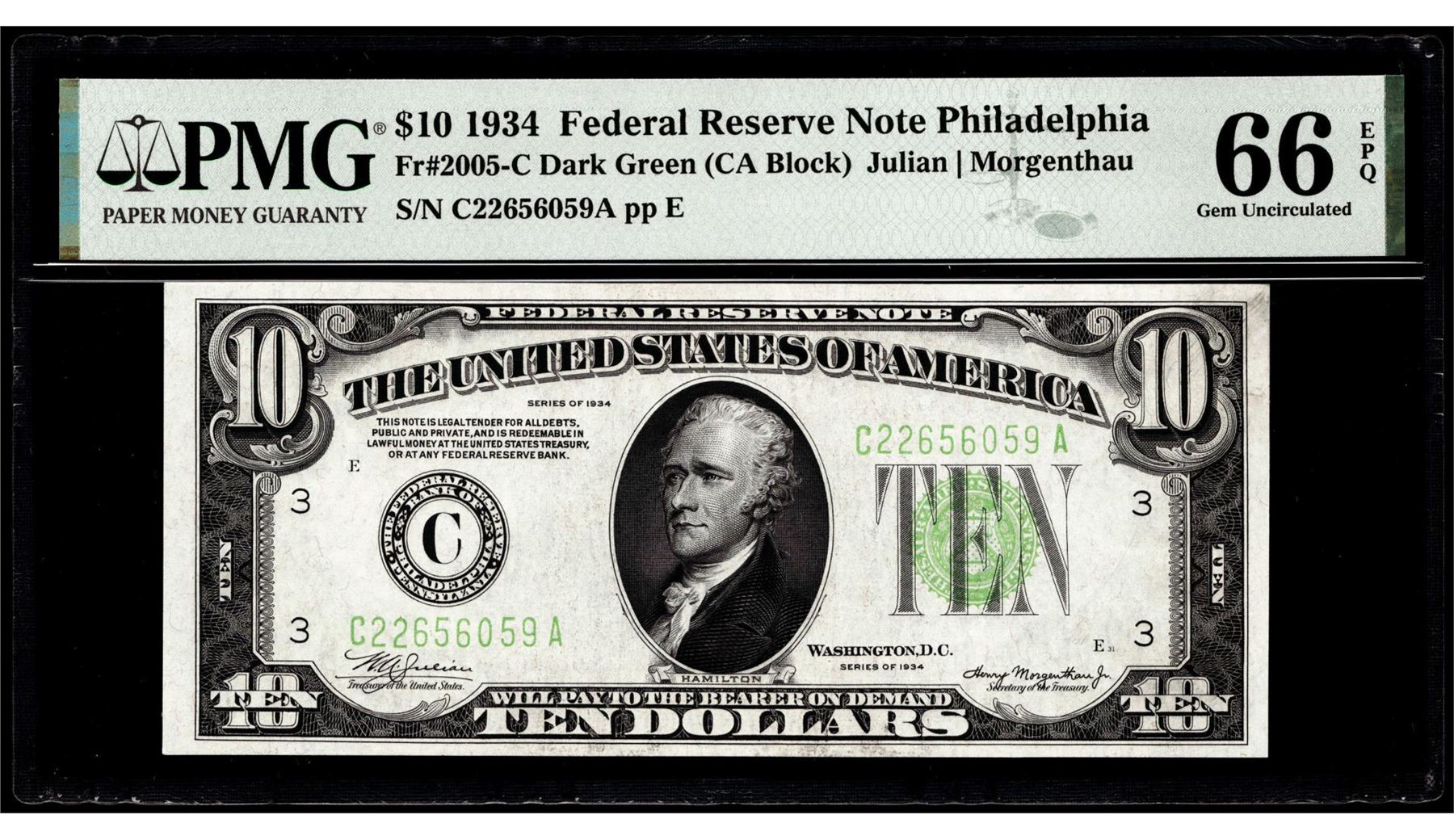 One 1934 $10 Federal Reserve Note Philadelphia Fr.2005-C PMG Gem Uncirculated 66EPQ. PMG Certified.