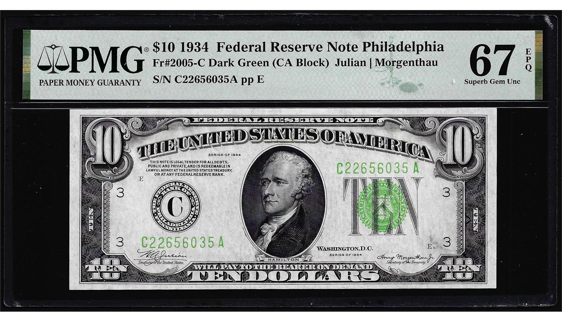 One 1934 $10 Federal Reserve Note Philadelphia Fr.2005-C PMG Superb Gem Uncirculated 67EPQ. PMG Certified.