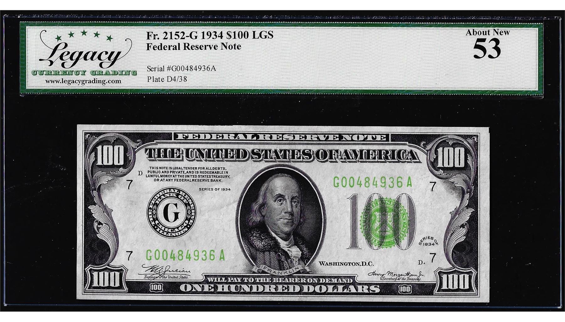 One 1934 $100 Federal Reserve Note Chicago LGS Fr.2152-G Legacy About New 53. Legacy Graded.
