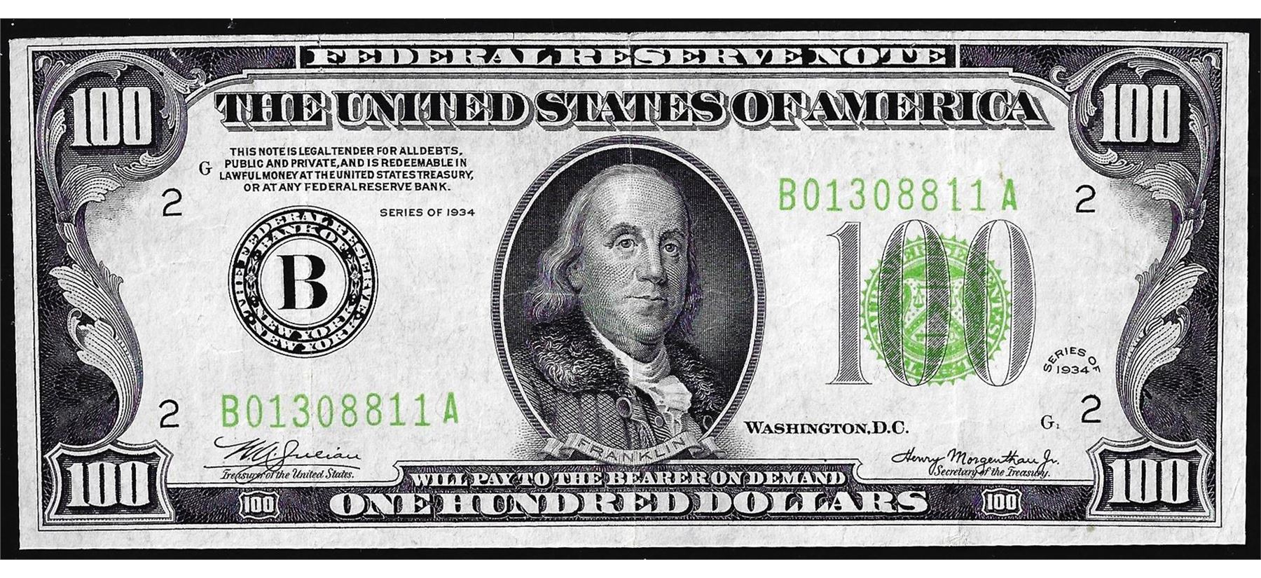 One 1934 $100 Federal Reserve Note New York Light Green Seal.