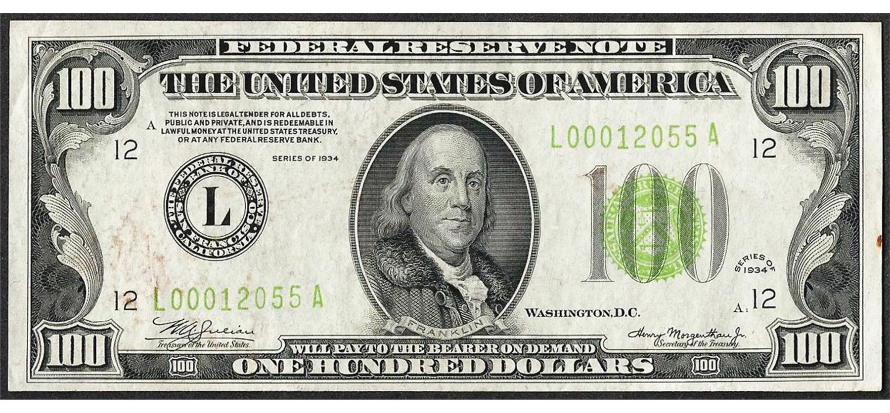 1934 $100 Federal Reserve Note San Francisco Light Green Seal