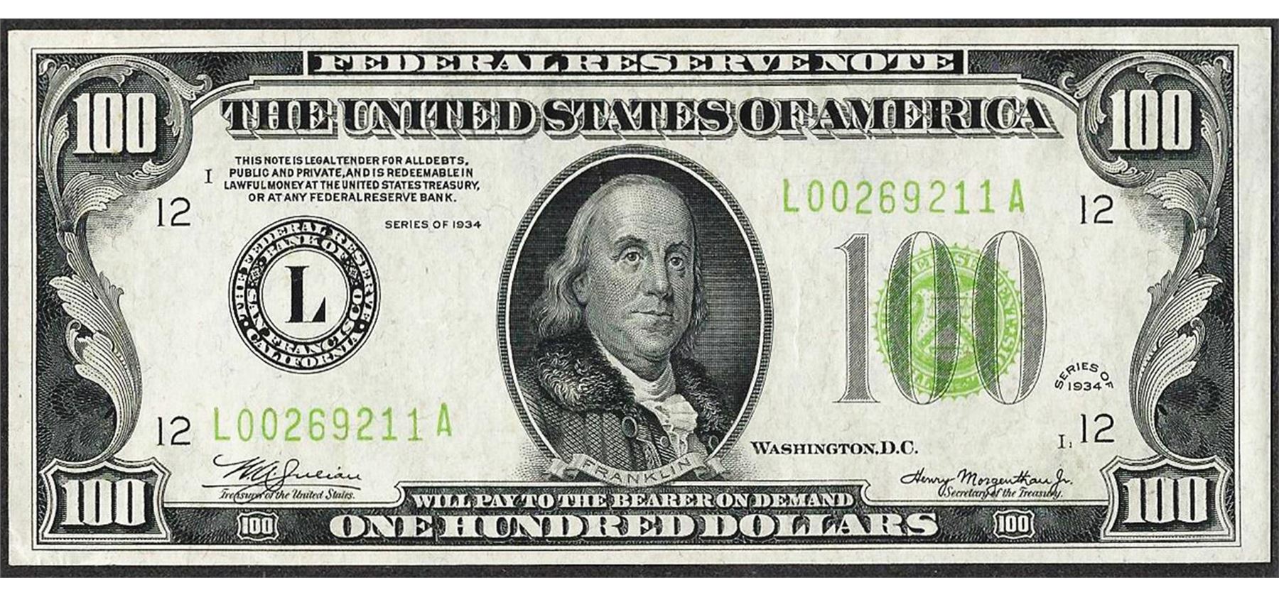 One 1934 $100 Federal Reserve Note San Francisco Light Green Seal.