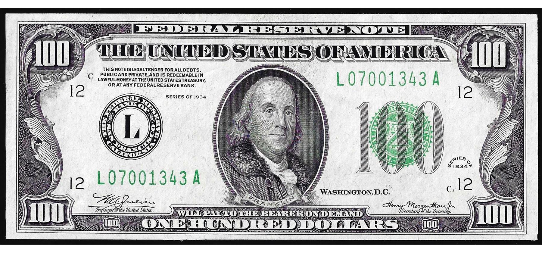 One 1934 $100 Federal Reserve Note San Francisco.