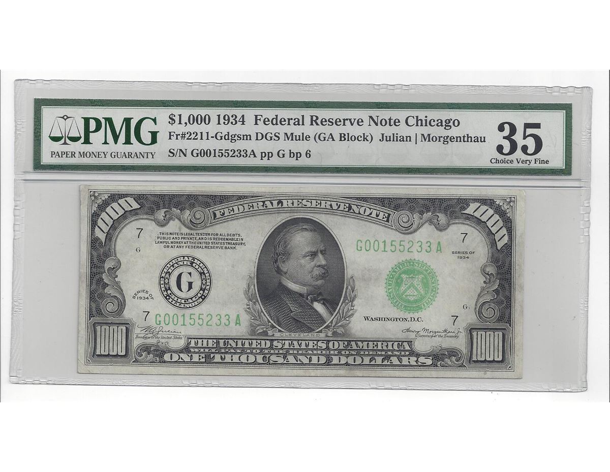 One 1934 $1000 Federal Reserve Bank Note Chicago Mule PMG Choice VF35.