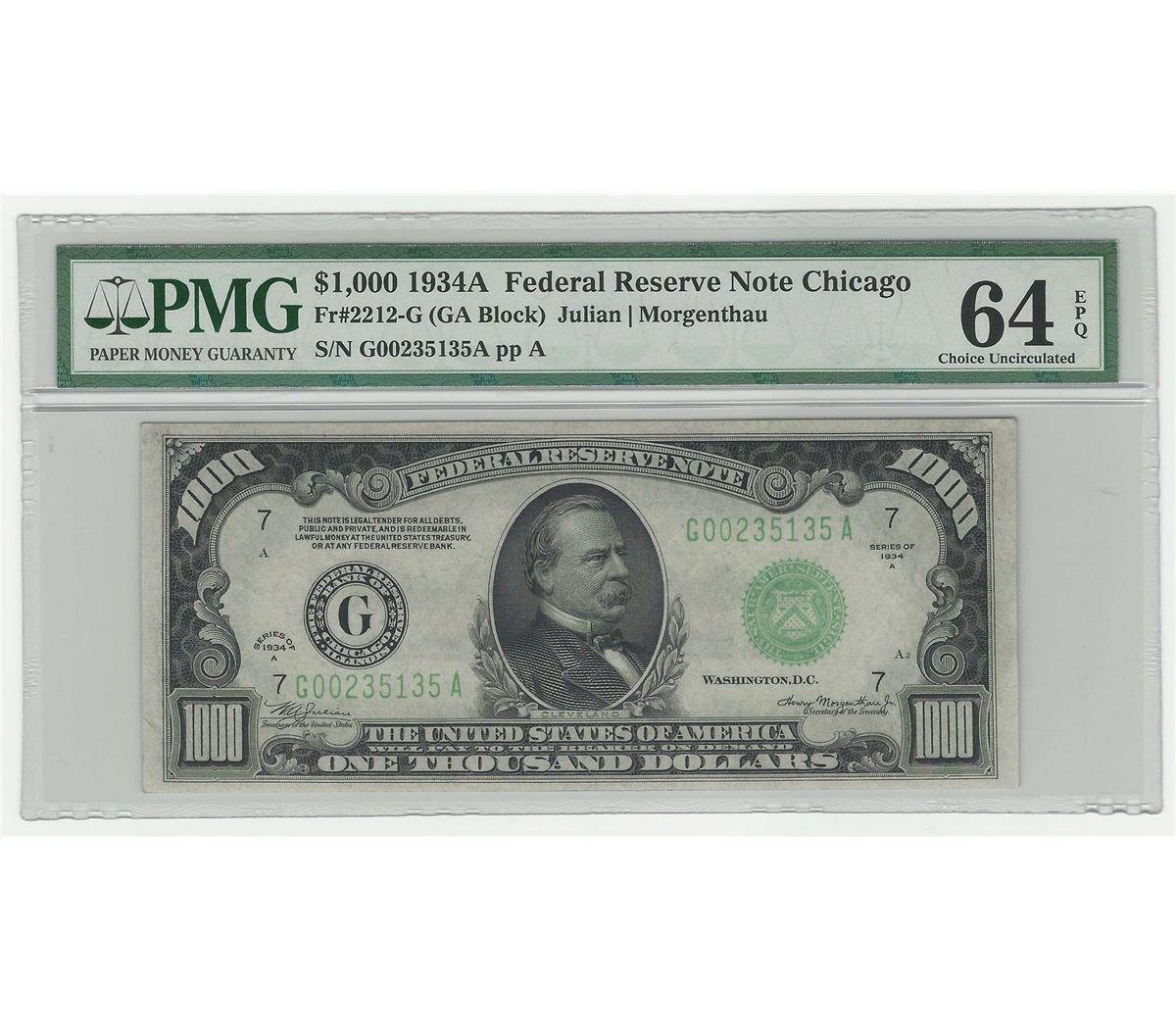 One 1934 $1000 Federal Reserve Note Chicago PMG Graded CU 64EPQ. PMG Certified.